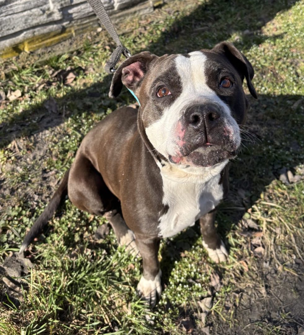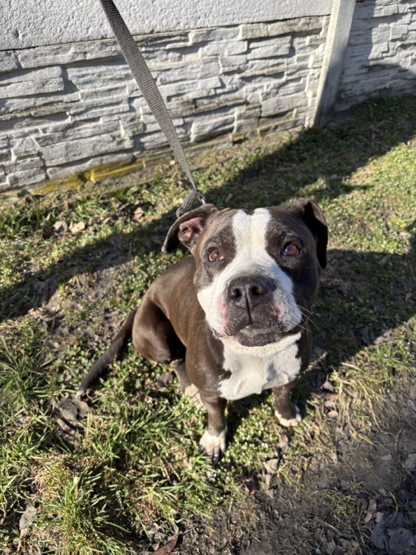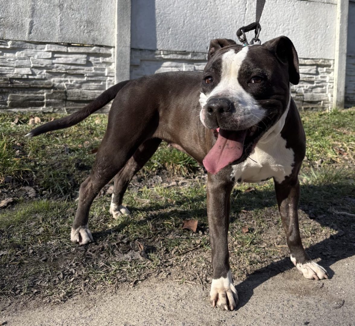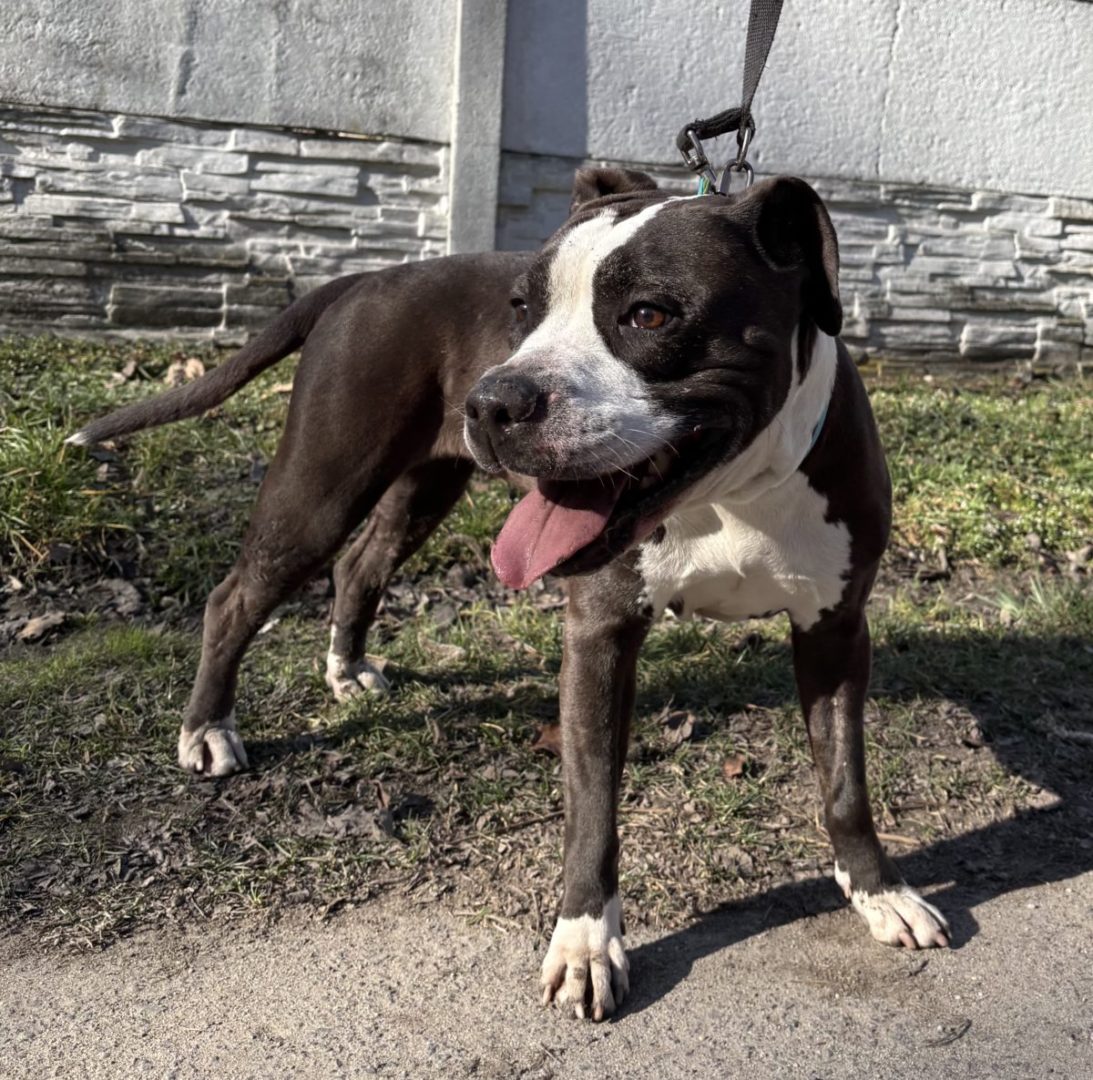 Hera to sunia w typie amstaffa. Ładnie chodzi na smyczy, nie ciągnie. Do ludzi jest bardzo łagodna. Na spacerach nie reaguje na psy, ale w kontaktach bezpośrednich bywa różnie