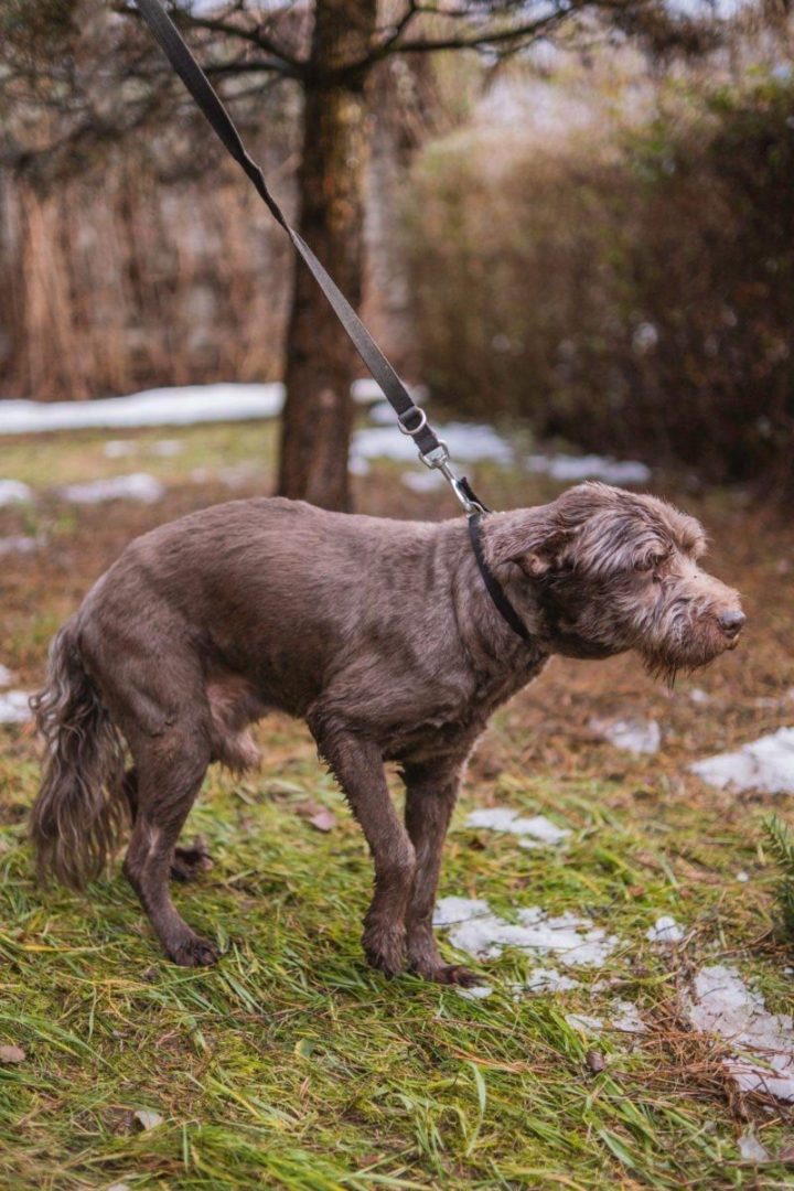 Jordan gdy do nas trafił, nie potrafił utrzymać się na łapach. Ale już jest zdecydowanie lepiej. Trupta sobie powolutku, nie ciągnie na smyczy. Jest cichy i bardzo spokojny. Ma chora tarczyce i musi przyjmować leki. Taka troszkę ciapa